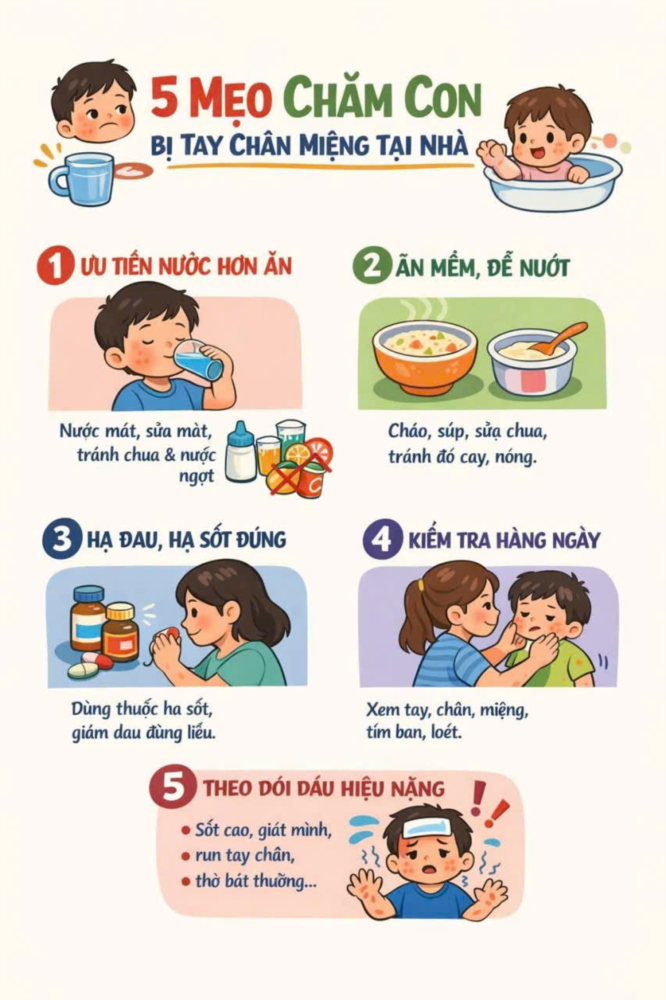 Tóm lại, mẹo quan trọng nhất là: giảm đau để trẻ uống được, theo dõi mất nước, và không bỏ qua dấu hiệu thần kinh hay hô hấp.