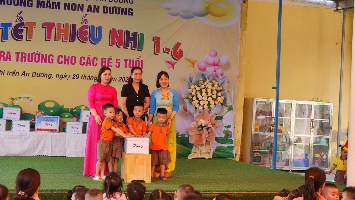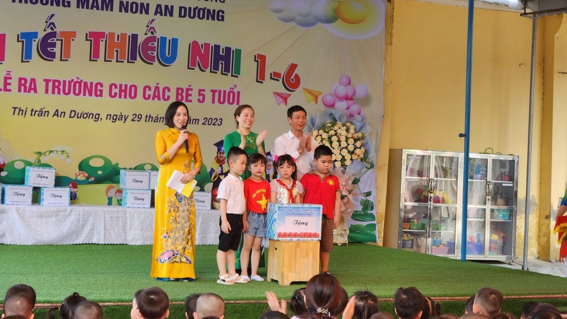 Những bông hoa phượng vĩ như thắp lửa trên những rặng cây báo hiệu một mùa hè đã đến, khép lại năm học 2022-2023. Ngày 29/05/ 2023 Trường mầm non An Dương long trọng tổ chức ngày hội “Bé vui tết thiếu nhi 1/6 và Lễ ra trường cho các bé 5 tuổi”. Đến dự tặng quà cho các bé có các đồng chí đại diện cho Đảng uỷ - HĐND - UBND - UBMTTQ thị trấn An Dương, Ban đại diện cha mẹ học sinh nhà trường cùng các đơn vị liên kết với nhà trường như: công ty liên kết với nhà trường (Công ty Đồ chơi Tín nghĩa, Công ty TNHH nông nghiệp công nghệ cao Hải Phòng, công ty TNHH Diệp Khuê, Công ty CPSX - TM - XNK toàn cầu GiGo, Trung tâm ngoại ngữ Châu Á Thái Bình Dương, Trung tâm can thiệp trẻ chậm phát triển Ban Mai, phụ huynh cháu Phùng Mai Hân lớp cơm thường A…! Chúc cho các bé 5 tuổi lên lớp 1 chăm ngoan, học giỏi và luôn nhớ về mái trường An Dương thân yêu nhé! Thay mặt tập thể CBGVNV và các cháu học sinh nhà trường xin được trân trọng cảm ơn sự quan tâm của các đồng chí lãnh đạo thị trấn An Dương, các bậc phụ huynh đã quan tâm cùng với nhà trường tổ chức thành công ngày hội vui cho các bé!