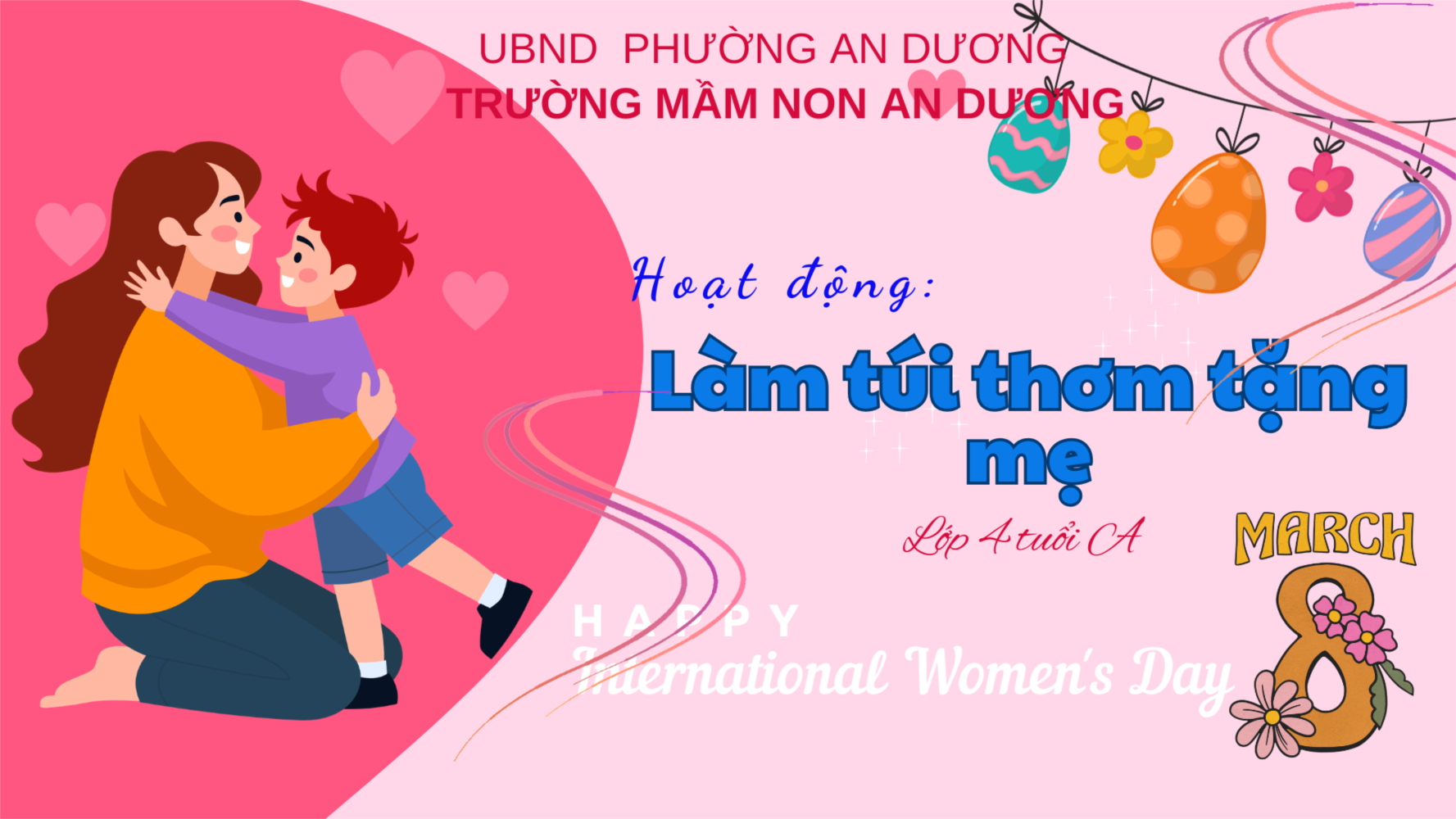 Nhân ngày 8/3, các bé lớp 4 tuổi A – Trường Mầm non An Dương đã cùng nhau tham gia hoạt động nhỏ thật ý nghĩa: Làm túi thơm. Từ những bàn tay bé xinh, các con cẩn thận chọn hoa - cây cỏ khô, gói gọn vào những chiếc túi xinh xắn như gửi gắm vào đó tình yêu và lời chúc ngọt ngào dành cho người phụ nữ con yêu thương nhất. Món quà tuy nhỏ nhưng chứa đựng tình cảm trong trẻo và sự khéo léo của các bé, mong mẹ luôn vui và hạnh phúc. Muốn biết các bé đã làm được gì, hãy đến với lớp 4 tuổi A để cùng tham gia hoạt động “Làm túi thơm tặng mẹ” nhé!